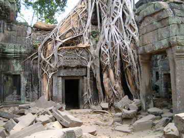 Der Tempel Ta Prohm wurde von Jayavarman VII. Mitte des 12. Jhs. zu Ehren seiner Mutter erbaut. In ihm befinden sich zahlreiche Reliefs von Tänzerinnen und buddhistische Figuren. Seine Besonderheit besteht allerdings darin, dass dieser Tempel nur notdürftig von den Überwucherungen des Dschungels befreit wurde. Wie gigantische Schlangen winden sich die Wurzeln der Würgefeigen um Säulen und Wände. |